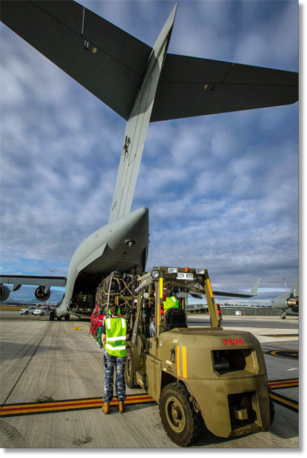 Royal Australian Air Force movements personnel from No. 23 Squadron, load a C-17A Globemaster headed for Exercise Shaken Fury in the United States. Coordinated by the United States’ Federal Emergency Management Agency (FEMA), the scenario for Exercise Shaken Fury centred on a 7.7 magnitude earthquake hitting Tennessee.