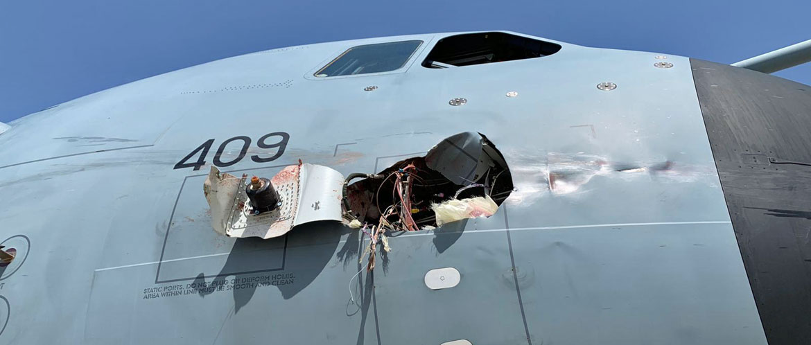 A Royal Air Force A400M was damaged following a bird strike while operating at Getafe Air Base, Spain. You might ask what kind of bird it was? I believe it was a dead one!