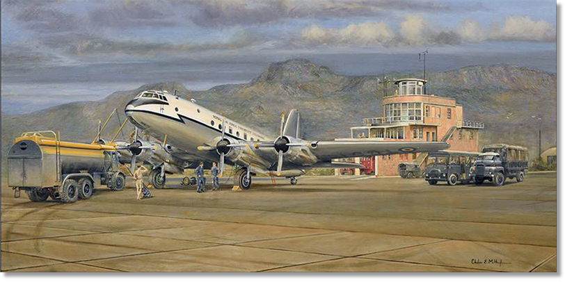 "Hastings at Nicosia" by Aviation Artist Chas McHugh. This oil painting shows an RAF Hastings aircraft on turn-round at RAF Nicosia Cyprus. Nicosia Airport remains technically an RAF base despite being embedded inside a UN Buffer Zone, and only used these days by UN helicopters.