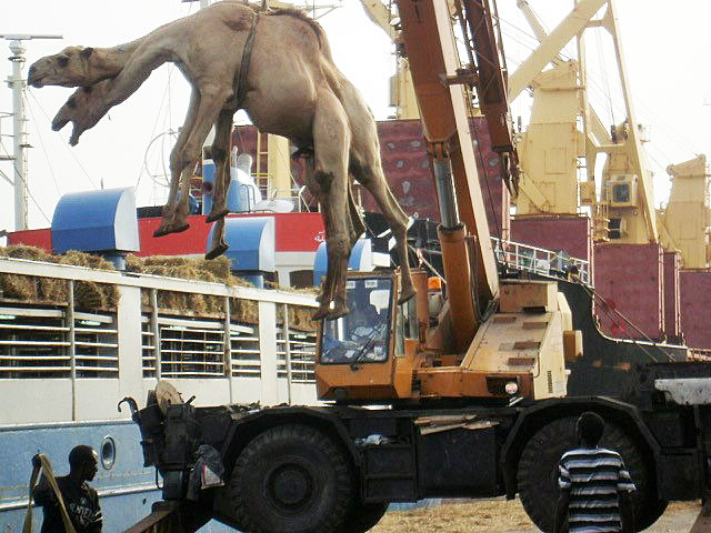 The reluctant ambulant cargo awaiting loading onto the vessel moored forward of us, and destined for Saudi Arabia, were apparently not too impressed with their mode of boarding, and no doubt had a less enjoyable journey than those being airfreighted in the clip in OBB #053121!