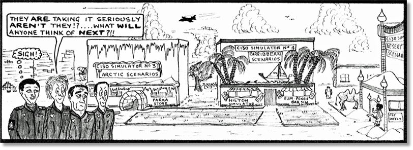 Footnote: I met Roger Payne a few months later when he brought a Herc up to Abingdon from Lynham for a local JATE task. He didn’t glow in the dark, but did admit that the entire crew of XV217 spent the whole time from Tengah to the UK on the flight deck, with the door closed and only very essential and equally very quick back downstairs to the dunny on the ramp!