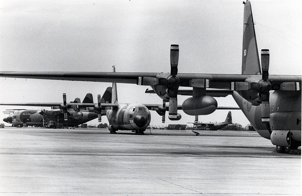 From then until Sunday lunchtime, I have no accurate recall of what happened hour by hour, only that throughout the next 60 hours, we handled a huge number of C130s, loading them with troops and palletised baggage with their engines still running. We snatched a little sleep. I got home to bed on Sunday at 1400 and slept for 22 hours.