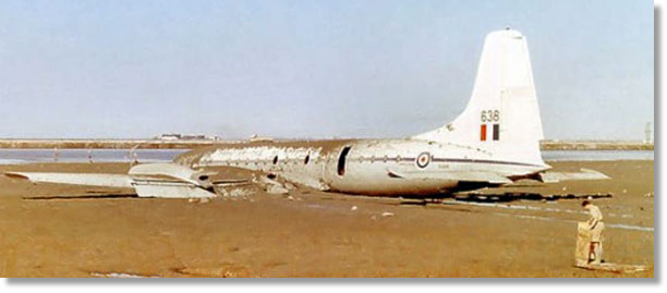 "It turned out that it was a ‘feathering’ classic. The Argosy (XP413 from 105 Squadron) had been up on training mission for a newly arrived pilot and one of the exercises was a practise engine failure on the approach to land at Khormaksar. The instructor pilot had shut down the port inner expecting the trainee pilot to feather that engine. Unfortunately in his anxiety to cope with the emergency the co-pilot feathered the port outer. The Argosy does not fly well on two engines particularly if they happen to be on the same side! As there was not enough time to relight the port inner or un-feather the port outer the Captain had no alternative but to ditch the Argosy in about three feet of water.”