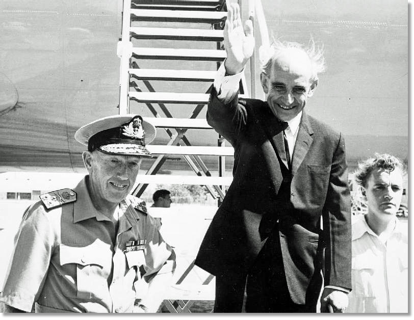 The departure of the High Commissioner of Aden, Sir Humphrey Trevelyan, from Khormaksar on 28 November 1967. The Commander-in-Chief in the Middle East, Admiral Le Fanu, is seen in the foreground.
