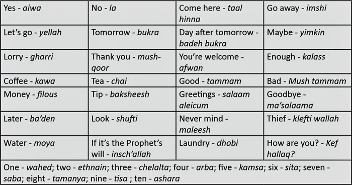 For day-to-day contact with the Adeni population, many of whom spoke some English, we had a basic vocabulary of Arabic. Together with body language, signs and sometimes a picture, we seemed to muddle through with the following limited range of Arabic: