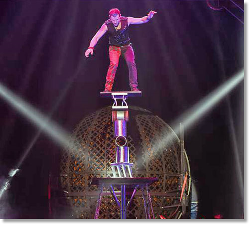 In the centre of the Casino there are constant circus acts and at that time a juggler was performing a board balancing act. He was stood on top of a six foot high oversized bar stool and then on a plank of wood on top of a roller.