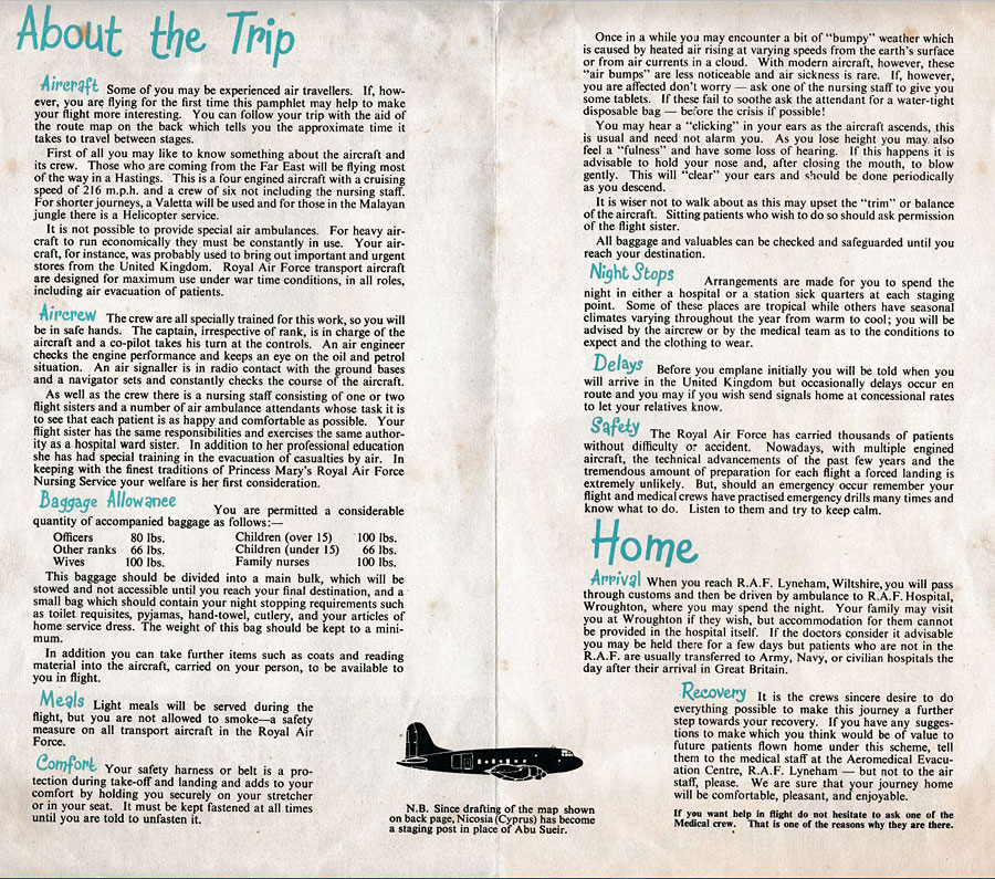 I've attached the leaflet that was handed out by the Movers [seems like this one is specifically designed for medevac patients]. In those days from the text it seems that the baggage allowance has not changed much.