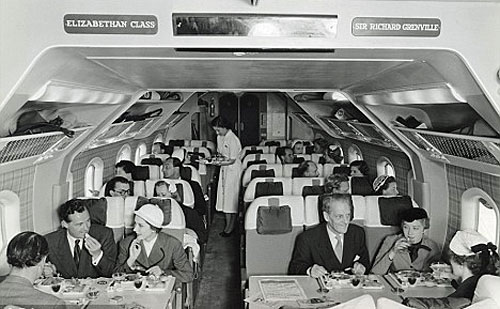 The inside of the plane seemed luxurious to me and it was not especially noisy. It was a great adventure and I was not the least bit nervous. Because I was 13, I was treated as an unaccompanied minor and had one of those huge labels hanging round my neck! Who met me in London, and how I got to my new school in Wem, Shropshire I have no idea!