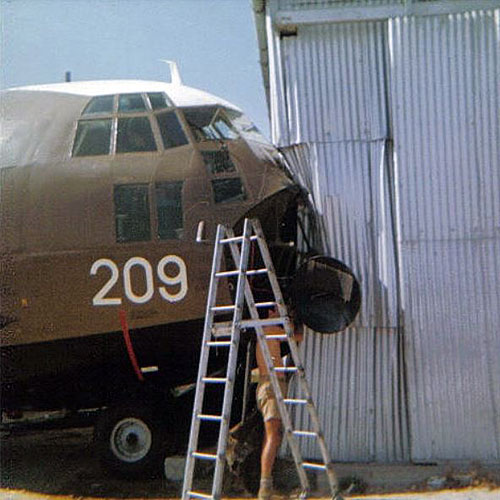 I was able to locate the photograph that Ian Berry made reference to and have attached it for you. Although there was no photograph of the exterior of the C-130 (they all basically look the same), the attached depicts the Westland Whirlwind helicopter inside of the C-130 - a lot more interesting and loading it was our bread and butter! The helicopter was transported from Leconfield to Akrotiri in December of 1979. Sgt Ian Berry, who was at that time based at Akrotiri Air Movements, is kneeling on the ramp.