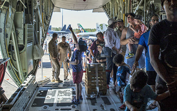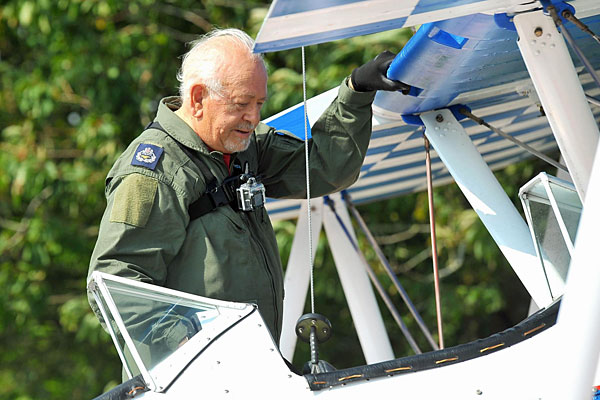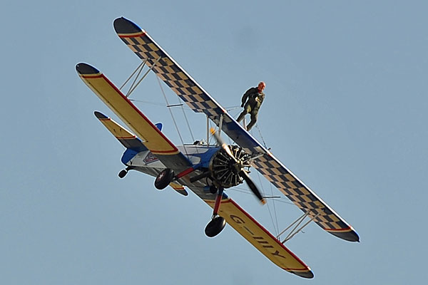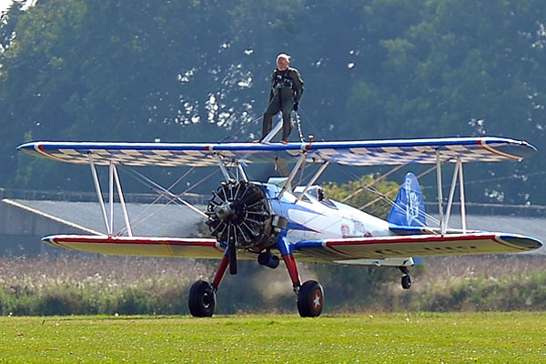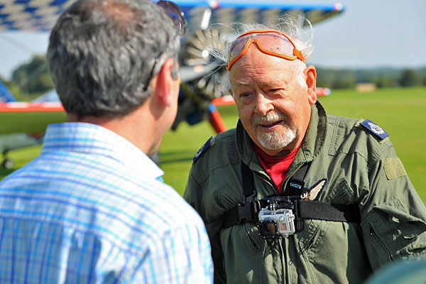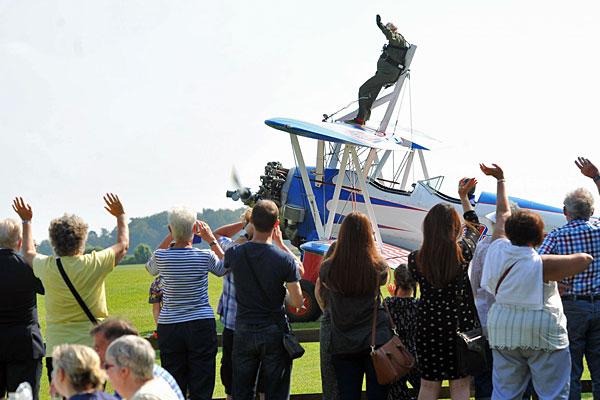 Mr Brown, who was in the RAF for 33 years and served at Lyneham, showed no sign of nerves as he climbed onto the top wing. Minutes later the aircraft was taking off into the blue sky and roaring over the spectators’ heads.
