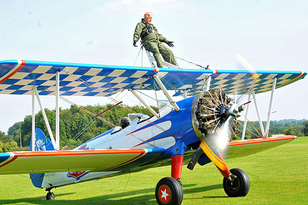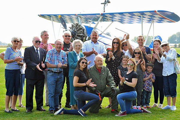 Family and former colleagues from around the country were at Rendcomb on Wednesday to see Mr Brown, from Upper Stratton, soar and swoop over the airfield strapped to the wing of a vintage Boeing Stearman.