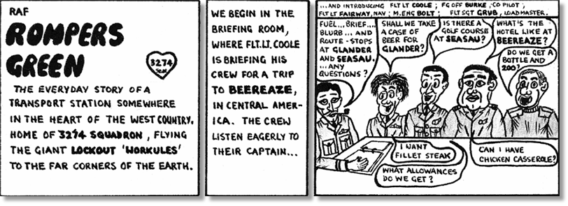 ROMPERS GREEN was born in the spring of 1977 when final plans were under way for the re-shaping of the Lyneham Globe. Dave Marlow, who was then running the Globe, suggested that the magazine could do with a cartoon strip and I, unwittingly, volunteered to produce it. My original concept was to follow the adventures of a typical squadron crew, as they battled their way around The Route and, from time to time, introduce various members of the station's support elements to make the scope of the cartoon as wide as possible.