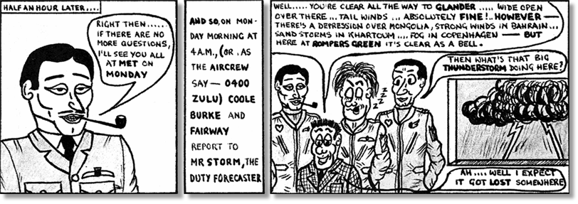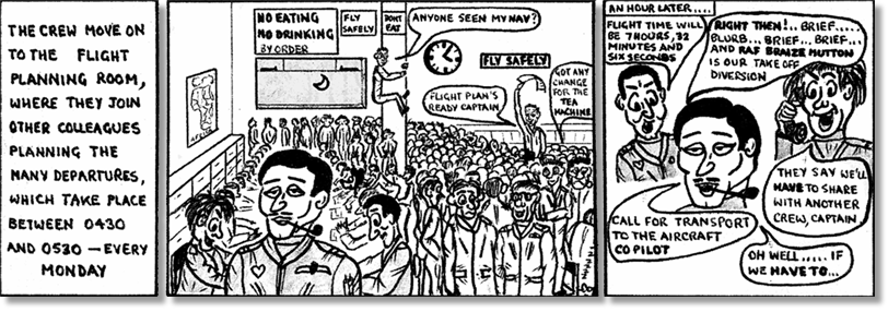 The actual production of the cartoon has been almost as international as the adventures it has depicted. Two episodes were drawn in Cyprus, whilst awaiting spares or slip-patterns. Episode Seven was produced, bit by bit, during the course of a Hong Kong schedule. I drew the last two frames, early one morning in the empty dining room of the Mess at Kai Tak, just in time to hand the completed page to a departing 10 Sqn. VC-10 crew, who kindly delivered it to the printers for me (thanks fellers!). Other episodes have been produced 'on location' variously in Glander, Seasau and Beereaze, which does not necessarily mean that I have been a Route Hog!