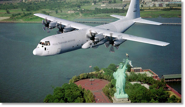 A RAAF C-130J Hercules flies over the Statue of Liberty, New York, 2000