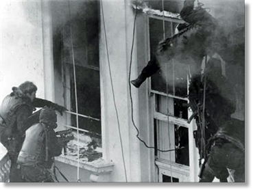 About 5 minutes later two ambulances arrived at the Movements building and out got two guys in pyjama's with drips in their arms and made their way into the crew room (of course we made them a cuppa). These were the first members of the SAS to gain entry into the embassy and were both suffering from a slight concussion. Two Scout helicopters arrived to transport them back to their home base at Hereford.