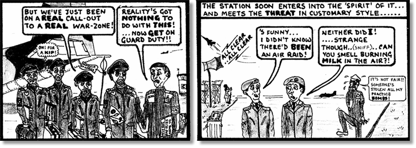I do remember that Tony Saw and Paddy Power were with me and, like Mike's experience, the trouble started as soon as we hit the ground. It's not necessary to repeat the whole story since, as I have already said, much of it mirrors Mike's own experiences but I do remember a rather obnoxious MT Corporal (perhaps it was in the Job Specification for this post) 'advising' both Tony and myself that he was "fully qualified to push load items up the ramp" with the aid of a Landover only (complete with wooden beam strapped to the bumper) and no other guidance requirements.