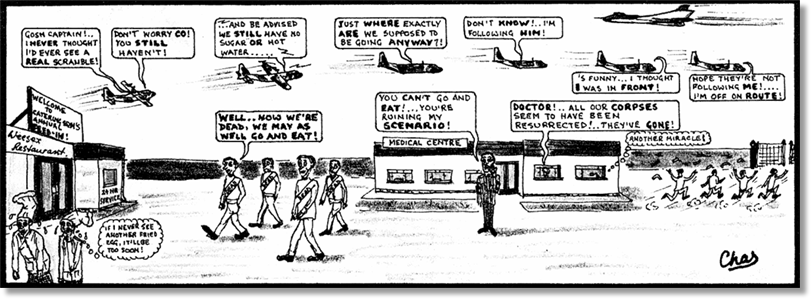 After the outgoing a/c was serviced the WO1 and I returned to the hotel to find the GP CAPT sitting in the bar deep in conversation with the Accounts Flt Lt. He called us over and asked us what we thought went wrong with the arrangements, hot bedding, transport and no food available.