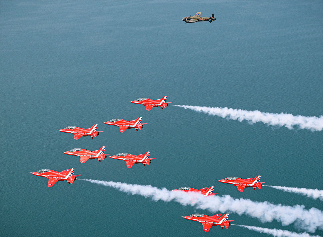 The Red Arrows with a Lancaster bomber heading to Niagara Falls - one of the high-profile flypasts of Maple Hawk