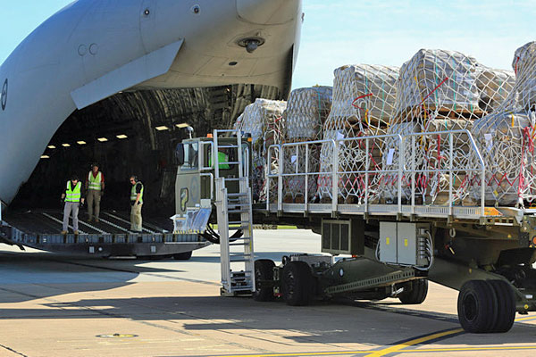 An Australian C-130J drops its 10-container cargo load over Trenton