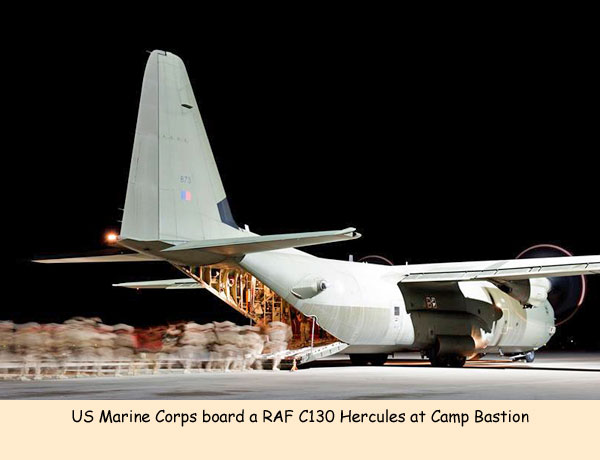 When the time came to leave we boarded an RAF C130 and left ahead of schedule, defended as we did so by the RAF Regiment before they themselves handed the perimeter to the Afghans. I’m immensely proud to have worked with such an industrious, enthusiastic and talented group of people. The drawdown of troops and equipment has been taking place since October 2012 and with overland transport seen as high risk, almost everything has had to be flown out of Camp Bastion. Wing Commander Andrew Garbutt commands the tactical air transport aircraft crucial to the operation. He said, Working hand-in hand with the USMC, this has been a meticulously planned and well executed operation where the tactical air transport capability provided by the RAF C130J Force has been absolutely vital to success.