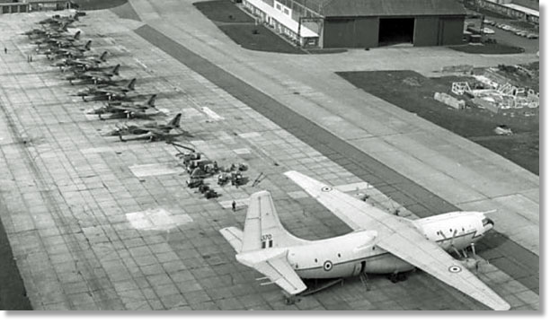 A Shorts Belfast sits alongside 54 Sqn Jaguars at RAF Coltishall