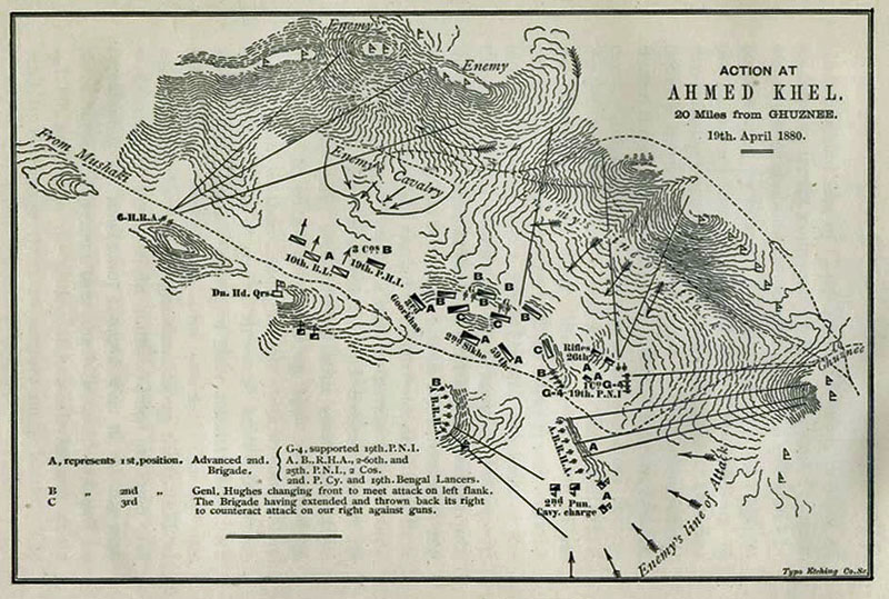 A Contemporary Account of the Battle of Ahmed Khel (extracted from a newspaper cutting circa 1880) - Throughout the whole of the Mutiny the stubborn valour of the Artillery was again remarkable. F Battery was also with the force under General Primrose which was sent to garrison Kandahar. In the action at Amhed Khel it behaved with conspicuous bravery. The action commenced at 9 0'clock precisely, and from that time till 10 a.m., when the " cease firing " sounded all along the line, the roar of the guns and the rattle of the Infantry fire never ceased for a moment.