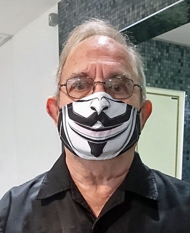 Donald Milburn, Swindon Made a trip to Kos, Greece, Sept/Oct so took my new protective mask. My wife Jan also had a cheeky one posing with the waitress