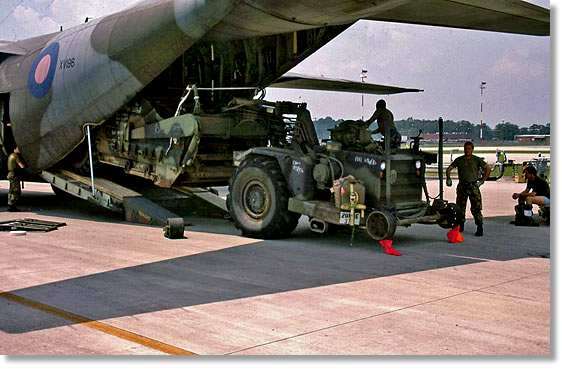 Anyway, going back to the photo. Part of the exercise scenario was to deploy a US Army Airfield BDR team to a remote strip. There were several we used in the exercise area but their names escape me and I can't find my logbook. The BDR team had various items of plant equipment which JATE had to trial-load and produce temporary tie-down schemes for. When the approval was given, the items deployed forward by RAF C-130 which, in true MAMS style, were offloaded very rapidly in ERO conditions.