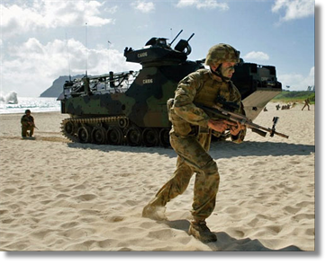 An Australian soldier crosses a beach during an assault exercise as part of multinational EXERCISE RIMPAC, in Kaneohe, Hawaii, July 29, 2014. Hugh Gentry/REUTERS