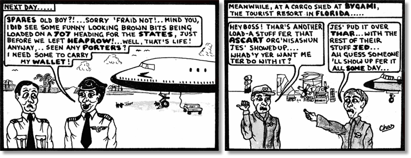 Dicky “deserted” after our distinguished pair reached the Antipodes, and retired to a Northumbrian fastness, there to contemplate, among other things, a somewhat chilly navel; but the indefatigable “Drac” remains a faithful, if slightly sardonic, chronicler of the heroes’ pilgrimage through the military transport world. In his spare time he flies Britannias, for a small fee.