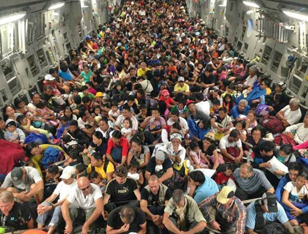 On December 16, 2013, a USAF C-17 flew a whopping 675 men, women and children out of Tacloban Philippines, in a single load